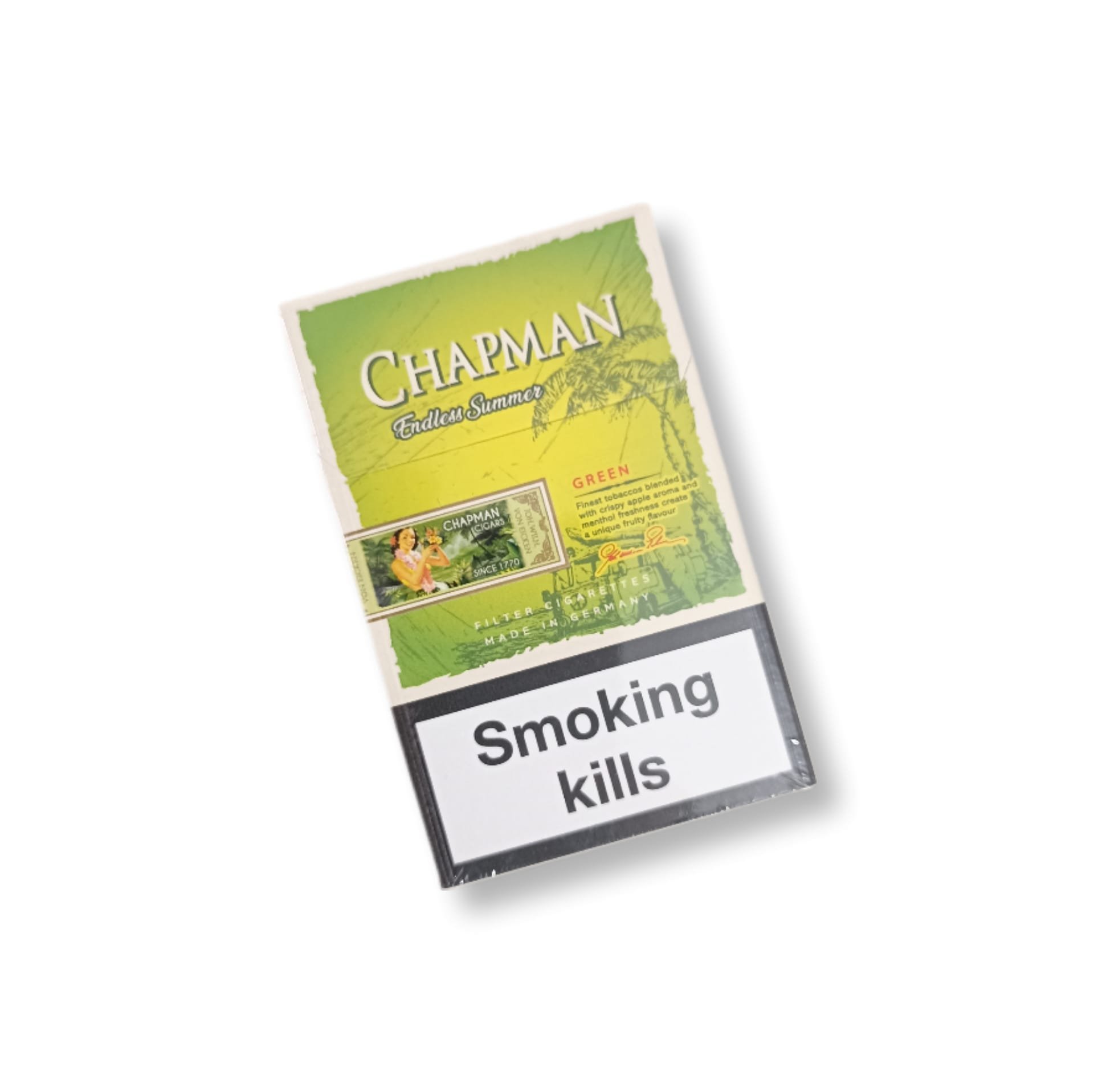 - Türkiye’de nadir bulunan ithal aromalı sigaralar arasında yer alan Chapman Endless Summer Green, orijinal ambalajı ve garantili tazeliğiyle sitemizde satıştadır. Farklı ve hafif içim arayan kullanıcılar için ideal bir seçimdir.