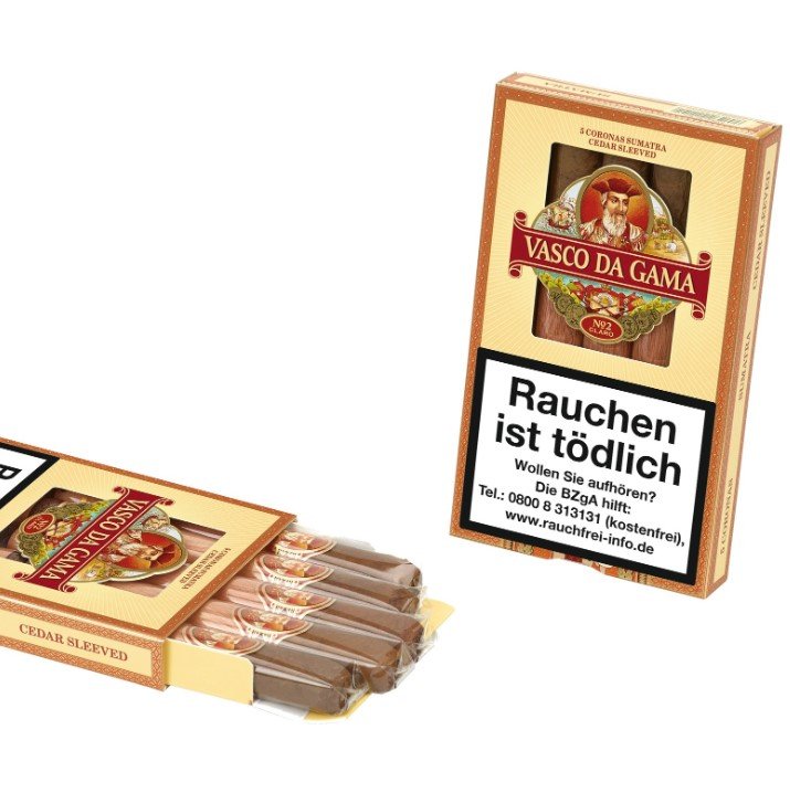 Vasco Da Gama No 2 Claro 5'li paket purolar, baharatlı ve dolgun bir tada sahip, makinede haddelenmiş bir purodur. Brezilya, Küba ve Sumatra'dan özel olarak seçilmiş tütünlerden yapılmıştır.